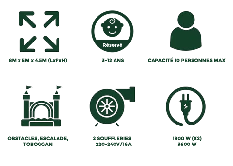Dimensions 8M x 5M | 4.5M Prévoir un emplacement de 9.5M x 6.5M